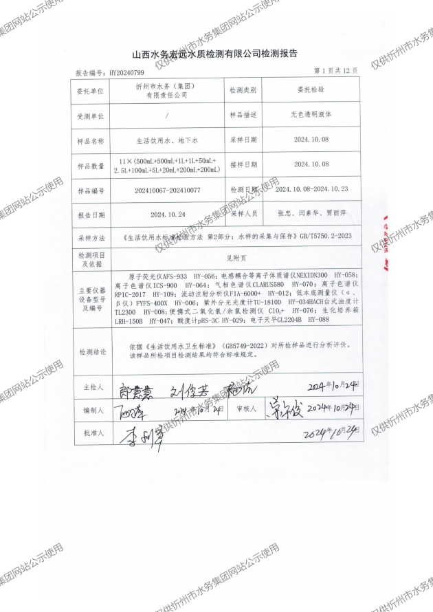 忻州城區(qū)公共供水水源水、出廠水、管網(wǎng)水、管網(wǎng)末梢水2024年10月份水質(zhì)信息公示