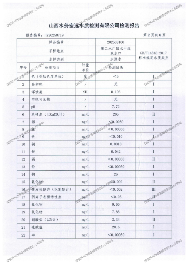忻州城區(qū)公共供水水源水、出廠水、管網(wǎng)水、管網(wǎng)末梢水2025年8月份水質(zhì)信息公示