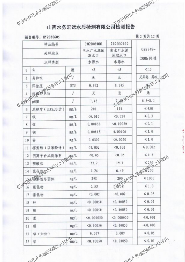 忻州城區(qū)公共供水水源水、出廠水、管網(wǎng)水、管網(wǎng)末梢水2020年9月份水質信息公示